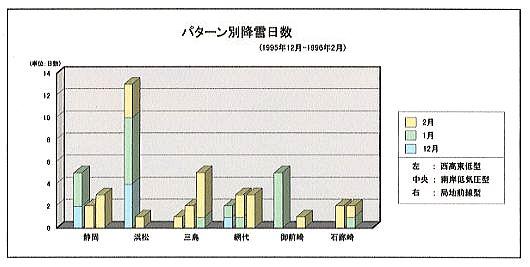 上の図は、1995年12月から1996年2月までに静岡県内の各気象官署(気象台や測候所)で雪が観測された時の天気図やその時の天気分布を調べ、前回述べた3つのパターンに分類してグラフ化したものです。ちなみに、1995〜1996年の冬はそれまで続いていた暖冬傾向から冬らしい寒さになり、静岡県内では平年より雪が多くなりました。